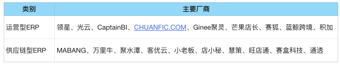 企业资源管理ERP为卖家对内的核心管理工作,围绕“物”、“人”、“财”展开。按产品功能延展方向 可将跨境电商ERP SaaS 分为运营型ERP和供应链型ERP,运营型ERP以ERP基础功能为基点,向营销端延伸数据分析、广告投放等功能,供应链型ERP以ERP基础功能为基点,向供应链端延伸寻源 采购、仓储物流管理等功能。 以下是主要跨境ERP厂商的简要情况: