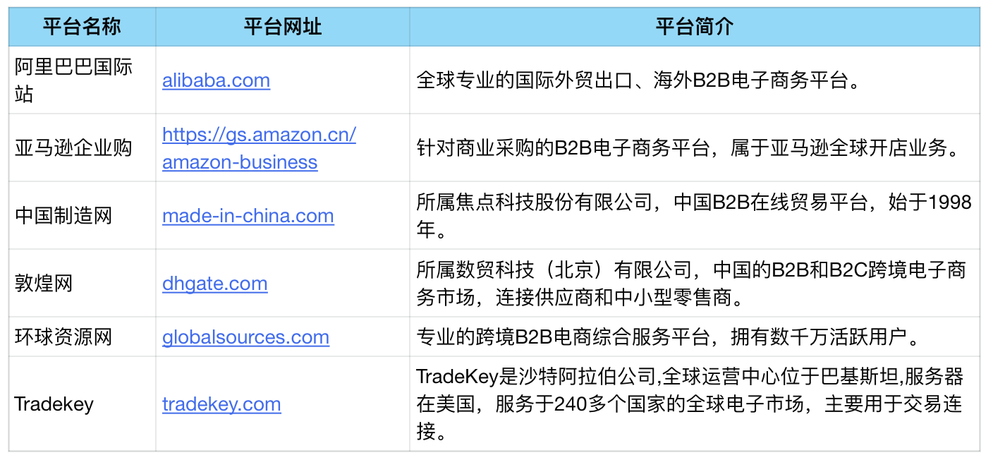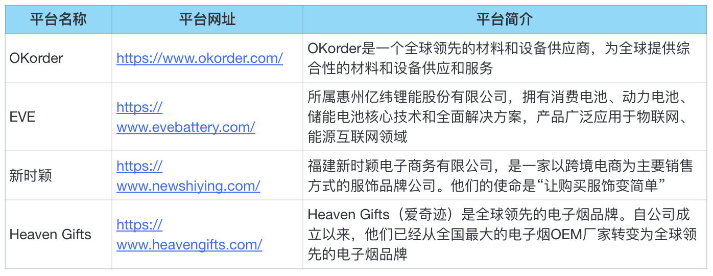 根据面向的用户不同,又可分为B2B和B2C。以下是主要平台方信息: