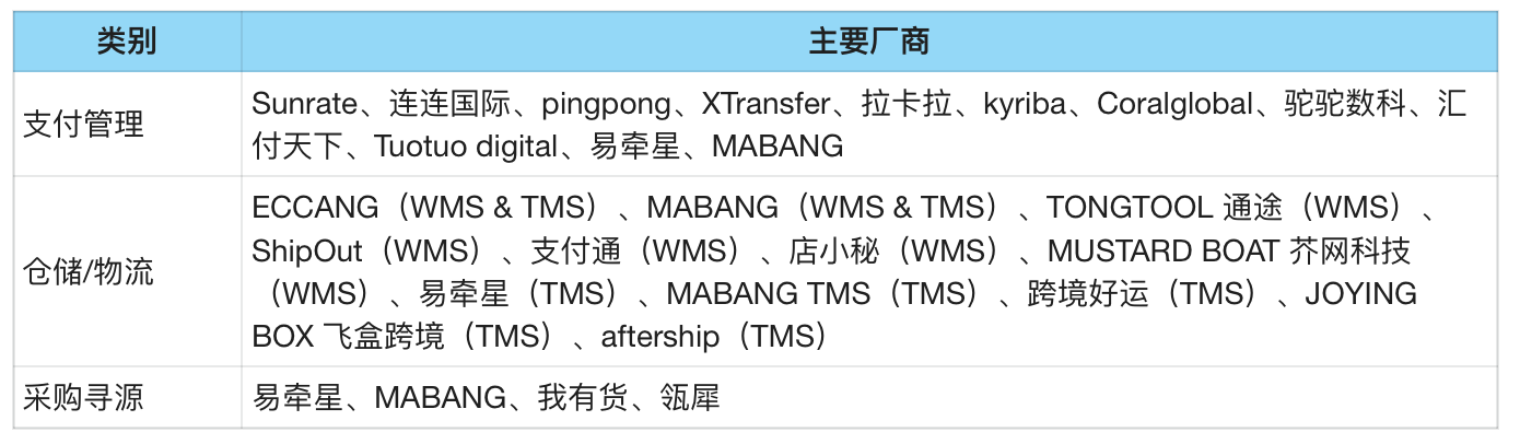 跨境电商供应链SaaS覆盖用户下单后的资金、物流和产品流转环节,分别对应跨境支付管理、仓储物流管理和采购寻源管理三个细分赛道。以下是主要跨境供应链服务厂商的简要情况: