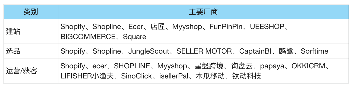 根据产品功能可将跨境营销SaaS分为建站、选品、运营、获客四类,覆盖跨境卖家从“0”到“1”的各种营销需求,由于各场景间功能和数据相互衔接,厂商们也在朝着一站式营销SaaS的方向构建产品矩阵。其中运营和获客厂商融合性高,而建站厂商的连接性强 。以下是主要营销服务商情况: