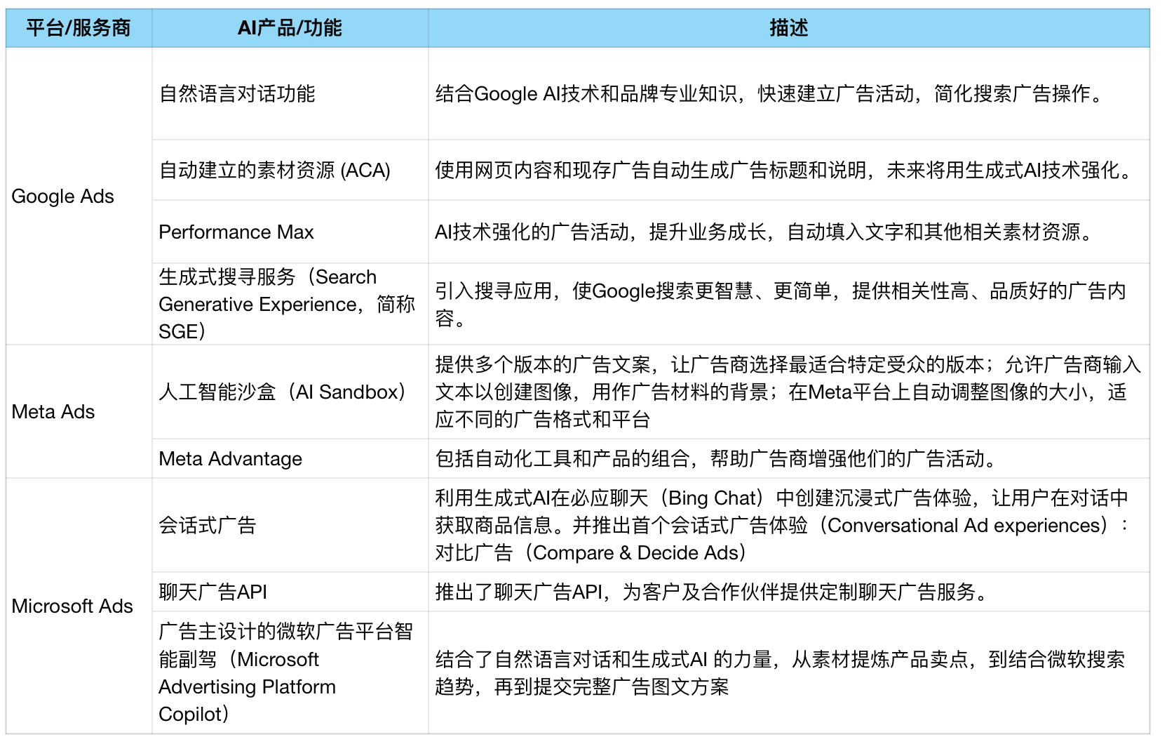 以推广环节的广告产品为例,当前普遍的产品功能都比较浅,因为基本上都属于基于营销物料快速生成,然后进行投放。而整个广告投放可能会涉及前期的广告策略制定(推广渠道选择、预算分配、推广产品分配等)、关键词研究、素材制作、竞价管理、效果监测和优化等重点环节,同时广告的投放效果也受到产品详情和网站的运营策略营销,AI产品如果能整合各个环节的数据,提供全链条的服务,将极大的提升广告的转化率。