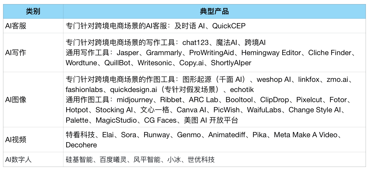 而推广环节的精准内容生成与投放决定了流量获取,销售运营环节的自动化和智能化决定了转化率和客单价,基础设施的高效解决方案决定了成本费用的高低,是跨境电商行业中最重要的三个环节,目前已有的AI产品也主要围绕着这些场景提供服务。