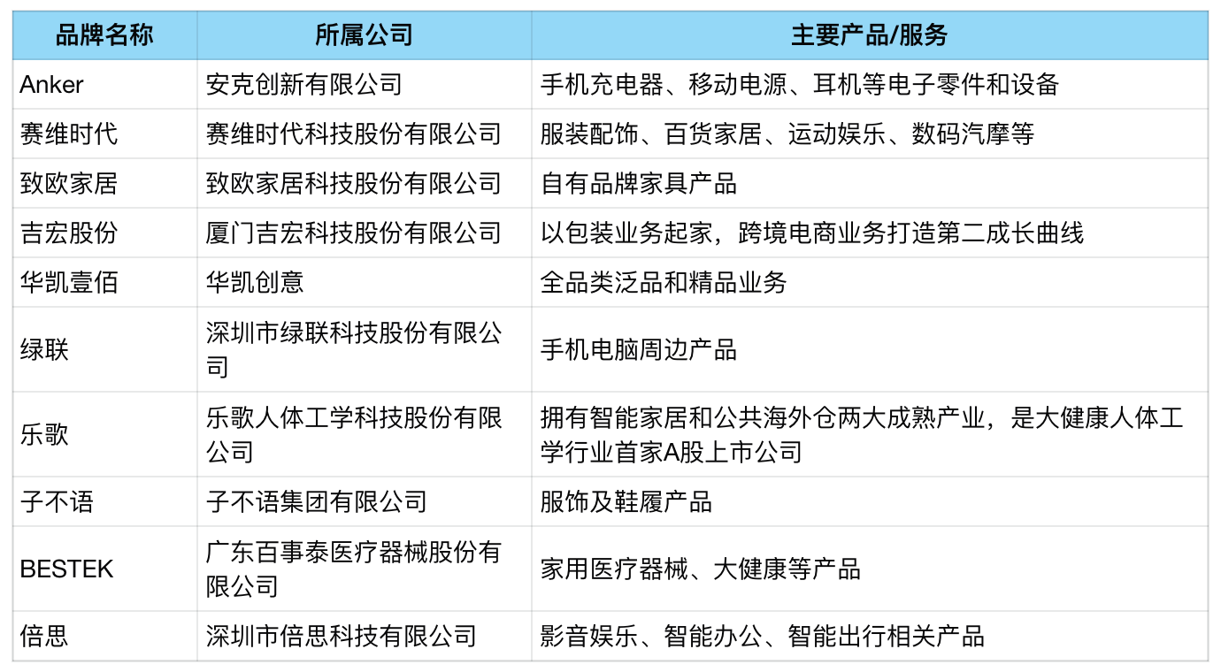 从以工贸一体化形式出海转向以品牌力形式出海,各品牌商不断强化自身数字化能力,加速整合供应链,提升品牌影响力。跨境电商品牌商/制造商会选择入驻第三方开放式平台+自建独立站组合。以下是主要品牌商/制造商信息: