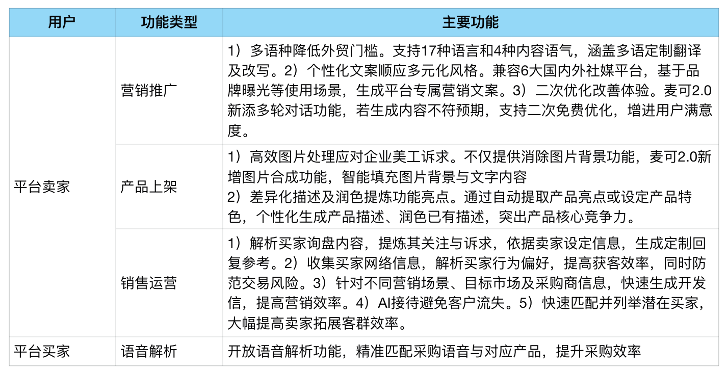 2023年5月15日,中国制造网正式面向全球买卖双方推出外贸企业专属AI助手“麦可 ”,目前已升级迭代三次。核心九大核心功能已涵盖营销推广、品牌出海及采购洽谈的外贸交易全场景,具备全链条AI服务支撑能力。