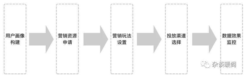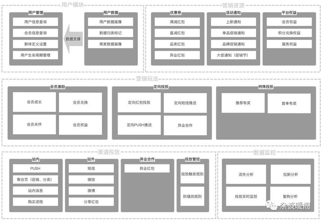 WHAT:用什么来营销,即营销的载体或资源。运营人员在进行宣导时需要通过一定的资源来与用户进行互动,这个资源包括但不限于红包、促销活动、内容推送等。WHY:为什么要做营销。即明确营销目标,比如拉新、促活、复购等。WHO:营销人群,目标人群需要确定一定范围的用户还是全员用户。如拉新时主要针对新客,而复购则主要面对老客。WHEN:营销投放的时间点,比如通过红包进行营销,则需要确定下红包发放的时间点,一般会在用户产生消费高峰的时间端之前。WHERE:在什么地点或者场景下进行营销投放。不同的场景营销的效果和手段也是不一样的,比如消费前和消费后营销方案不会是同一个方案。HOW:营销玩法如何制定执行,营销玩法其实包括上述的几个要素,人群,时间点,产品载体和场景。通过这些行为共同组成最终的营销玩法,不同场景下的玩法规则也不尽相同,具体的规则可以遵照上文我们讲到的一些消费行为模型来制定。HOW MUCH:投入产出比,营销行为本身就是一个高支出的行为,如果没有投入产出比的监控和分析就会出现失控的状况。所以对于营销的ROI需要进行一定的管理和分析。拆分后我们可以看到运营人员需要几部分信息进行营销行为。包括营销资源(WHAT)、用户信息(WHO)、营销玩法规则(HOW)、触达渠道(WHEN、WHERE)、数据监控分析(HOWMUCH)。系统或运营专员按照营销行为的顺序逐步完成每一部分的设置最终完成方案妥投,以此为基础我们来搭建CRM的产品框架。