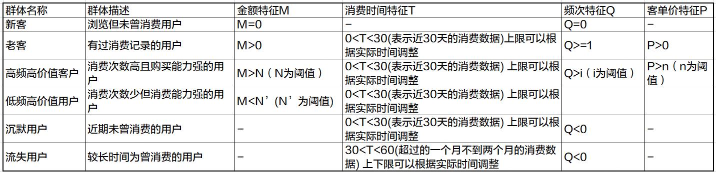 按照这个标准我们以电商类营销中最常见的几个用户群体为例看下四个主要特征拆解后的情况。有一些用户群体定义时不一定是需要四个维度都具备考量。