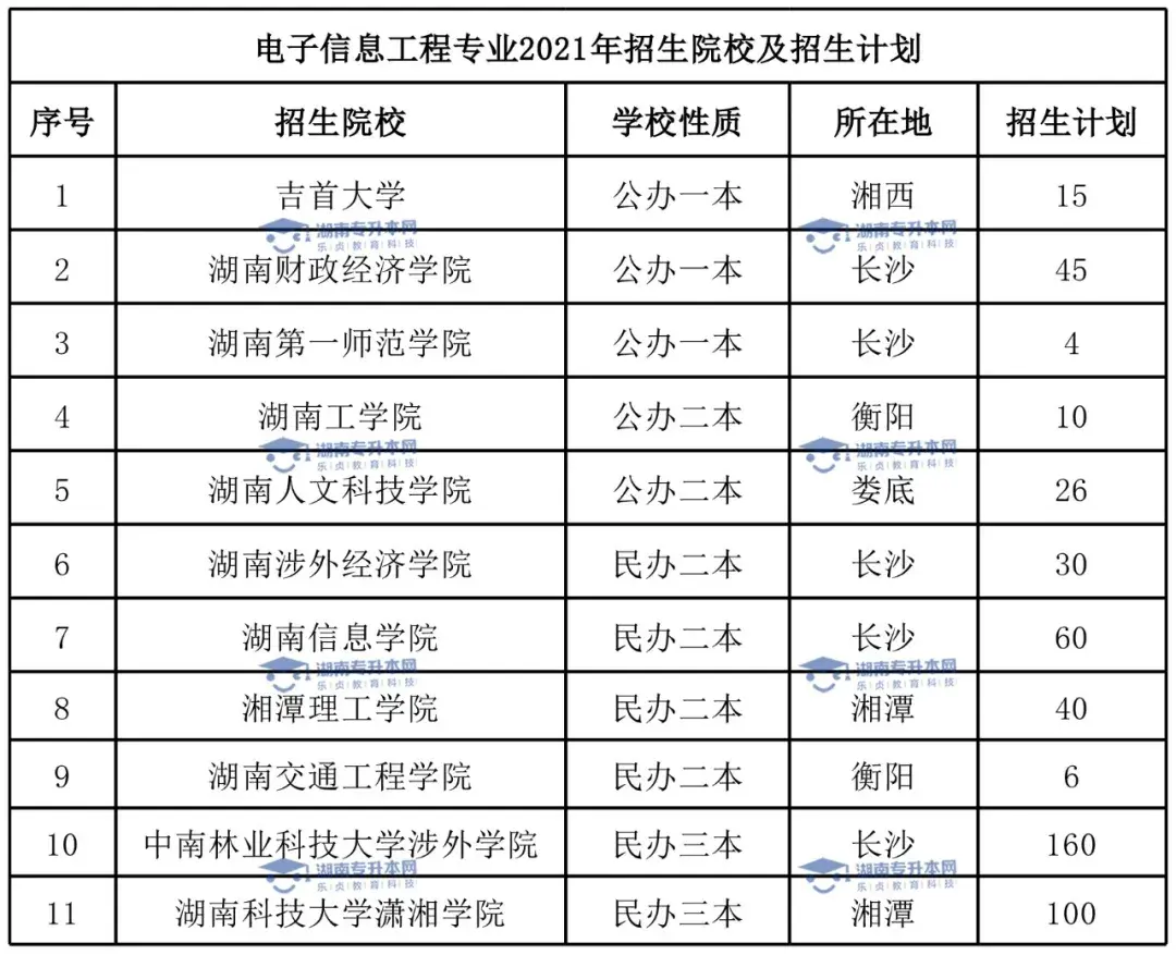 2021年全省44所本科院校参加“专升本”招生,其中11所院校有电子信息工程专业的招生计划,包括3所公办一本、2所公办二本、4所民办二本和2所民办三本。