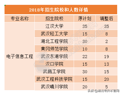 招生计划说明:原计划是指该校招生简章中公布的招生人数,调整后是指根据实际报考人数增减后的招生人数。前4所为公办院校,其中江汉大学招生人数最多,湖北工程学院在2016年有招收该专业,2017年停招一年,在2018年重新招收电子信息工程专业,但调整后招生人数仅为2人,说明报考人数较少。