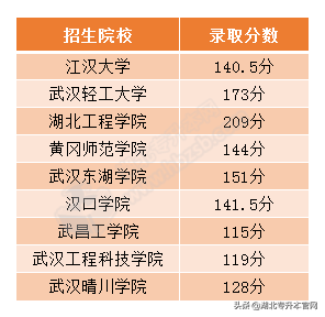 分数说明: 专升本考试没有规定分数线,这里的录取分数即各专业录取的最后一名考生的成绩。江汉大学、武汉轻工大学、黄冈师范学院专升本、湖北工程学院、汉口学院总分300分,武汉东湖学院、武汉工程科技学院、武昌工学院、武汉晴川学院总分200分。