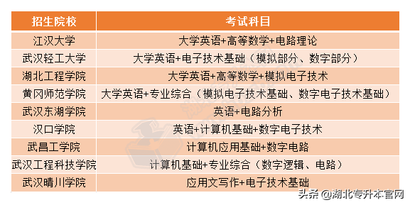 录取时若遇到最后一名成绩同分的情况,江汉大学优先比较专业课电路理论的成绩,再比较英语的成绩,择优录取,武汉轻工大学则先比较英语成绩,再比较专业课成绩;武汉工程科技学院比较专业课的成绩。黄冈师范学院设置了电子信息工程专业英语最低线为43,过线的考生再按照成绩总分从高往低录取。