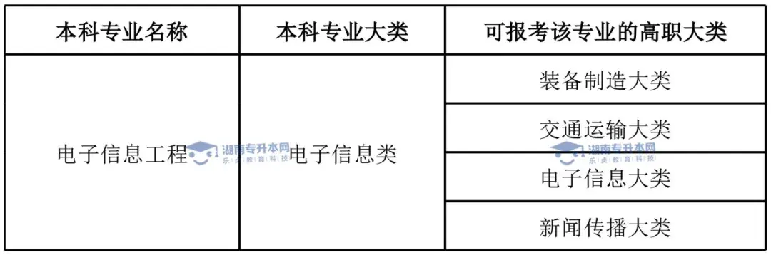 电子信息工程专业属于电子信息类,根据湖南省教育厅发布的高职专业大类匹配本科专业大类表,可报考该专业的高职大类有装备制造大类、交通运输大类、电子信息大类和新闻传播大类。 由于这四个大类包括的专业众多,因此相较于其它本科专业,可报考电子信息工程专业的考生人数还是比较多的。