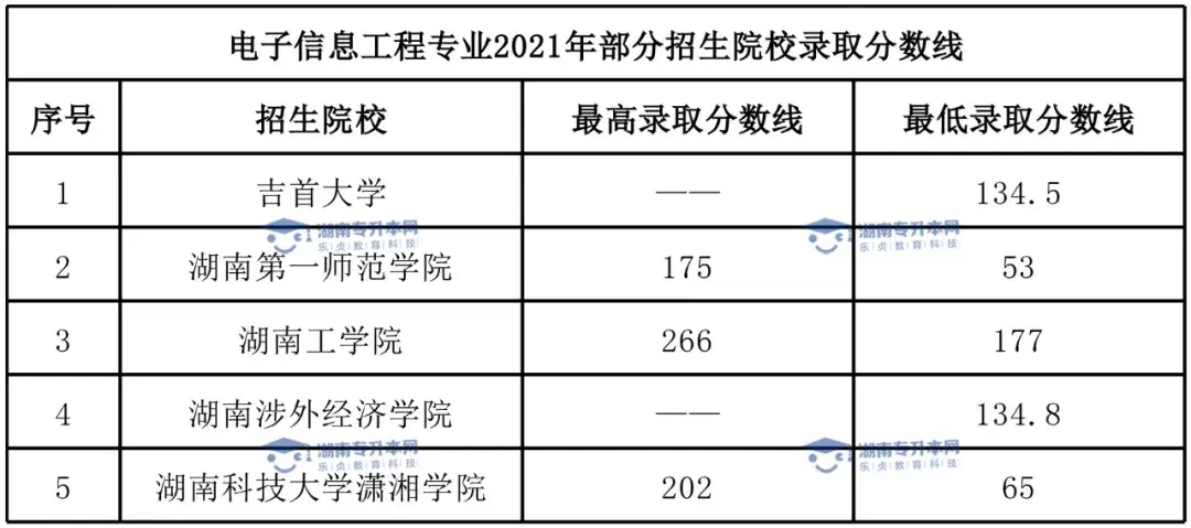 在2021年湖南“专升本”招生电子信息工程专业的11所招生院校中,有5所招生院校能查询到最低录取分数线,其中湖南工学院的最低录取分数线是177分,是已公布的招生院校中最高的。 湖南第一师范学院和湖南科技学院潇湘学院的最低录取分数线在70分以下,湖南第一师范学院录取分数低主要由于招生计划少,报考人数也少。