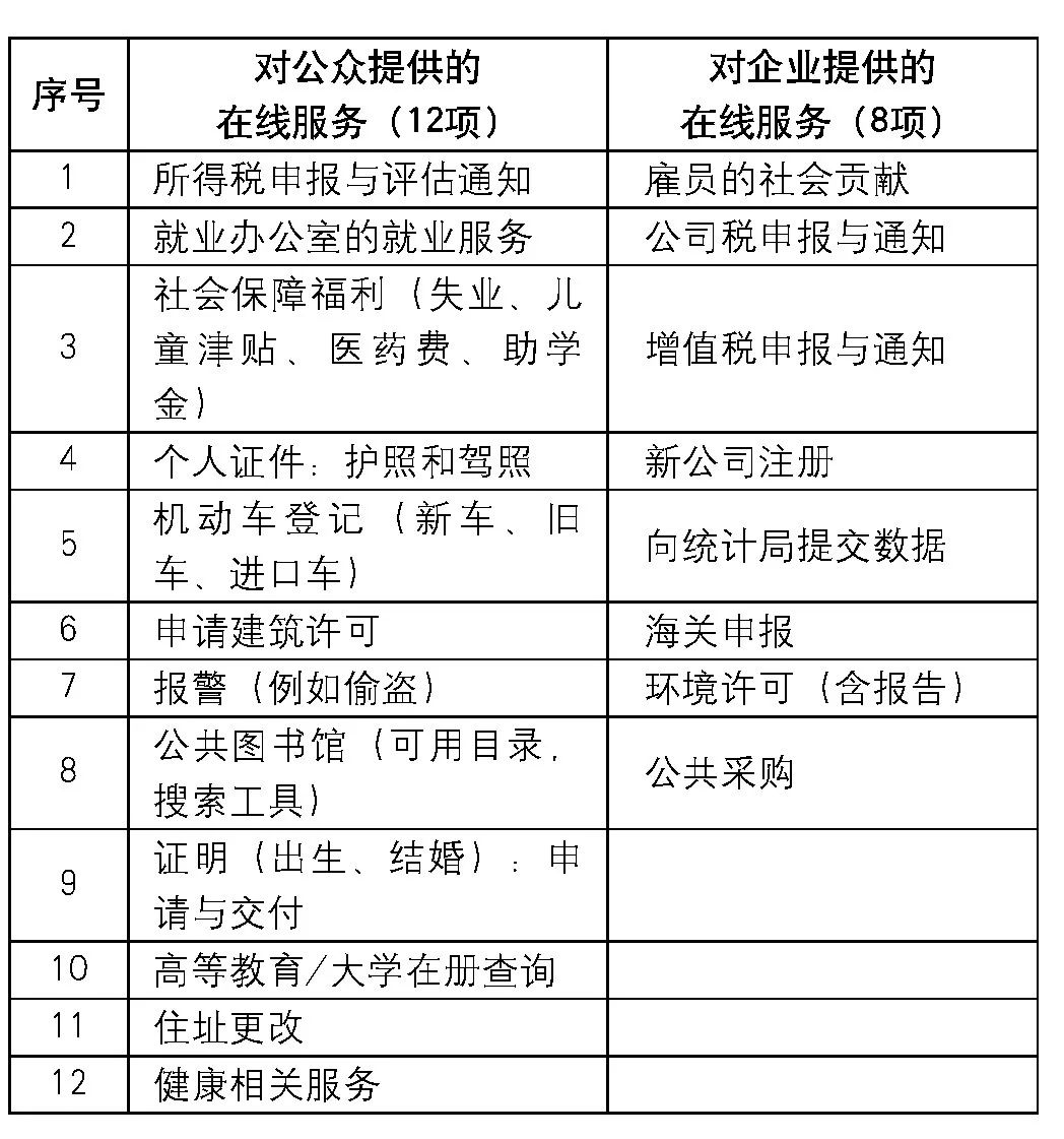 英国政府按照欧洲委员会和成员国在2000年的e Europe倡议中确定的20个基本公共服务建设标准, 根据本国国情分别对公众和企业在其官网提供相应的在线服务 (参见表1) 。