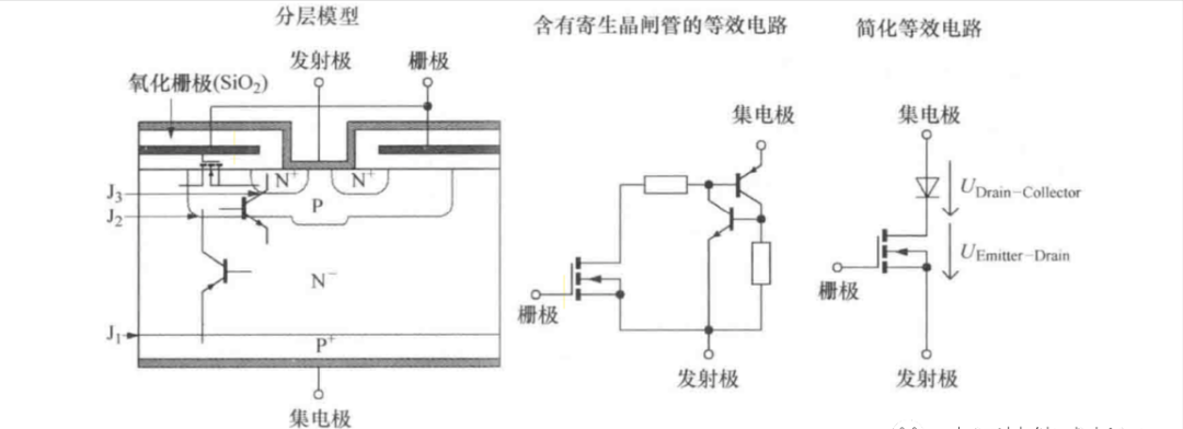 IGBT称为绝缘栅双极性晶体管,它结合了MOSFET的驱动优势和双极性晶体管的优势。IGBT的内部结构和等效电路如图1所示。从结构上看,IGBT更像垂直型MOSFET,不同之处在于它在漏极增加了高掺杂P+层,称为集电极。当栅极电压小于开启电压时,IGBT关断。此时,发射极电压远小于集电极电压,状态为正向阻断,PN结J2阻断。而PN结J1和J3正偏,为了获得足够的阻断能力,N-区需足够宽,掺杂浓度尽量低。