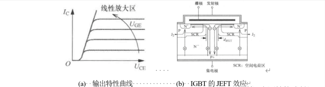 IGBT输出特性如图2a所示。若栅极电压太小,形成的反型层较弱,流入漂移区电子数相对较少,IGBT的压降增大,进入特性曲线的线性放大区。当IGBT工作在线性放大区时,损耗加剧,严重会损坏器件。故器件应避免进入线性放大区。