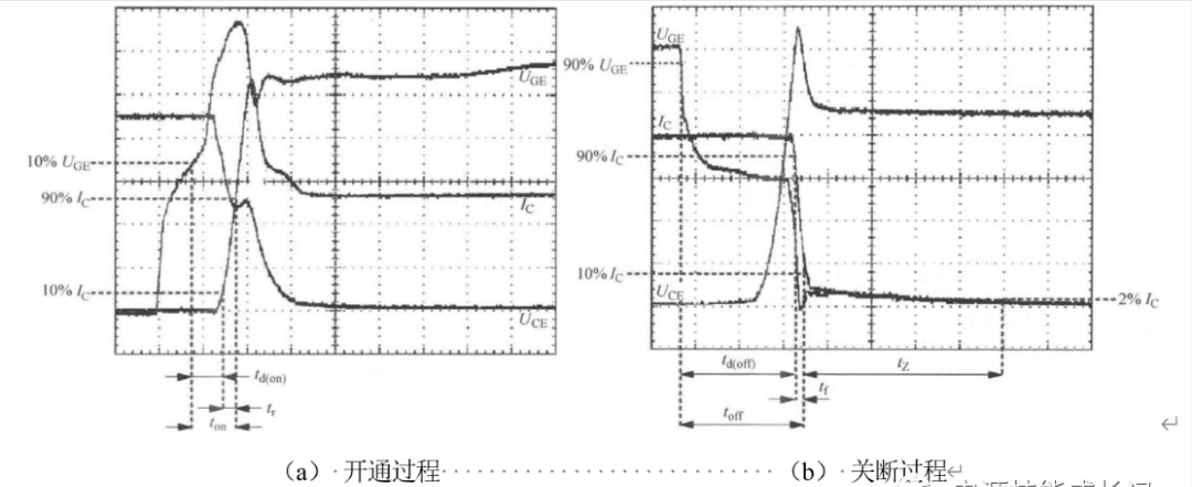 (13)开通延时td(on):IGBT的栅极开启电压脉冲到集电极电流开始上升的时间间隔。通常以栅极电压幅值的10%和集电极电流10%作为开通延时计算参考点。