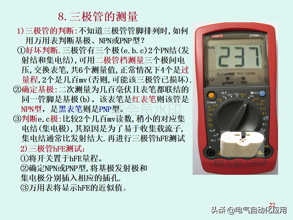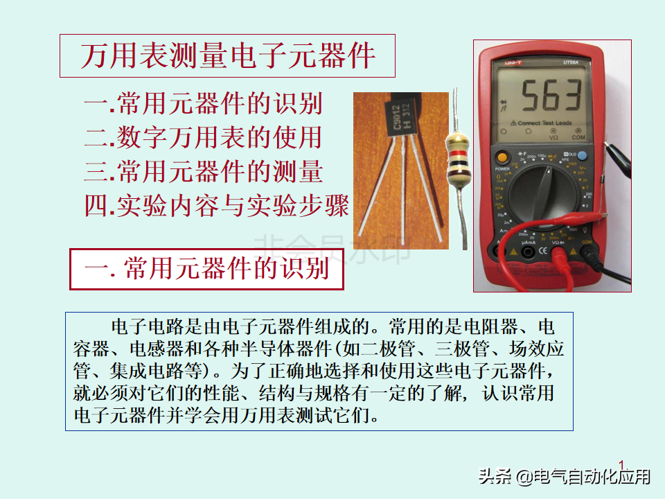 电子电路是由电子元器件组成的。常用的是电阻器、电容器、电感器和各种半导体器件(如二极管、三极管、场效应管、集成电路等)。为了正确地选择和使用这些电子元器件,就必须对它们的性能、结构与规格有一定的了解, 认识常用电子元器件并学会用万用表测试它们。