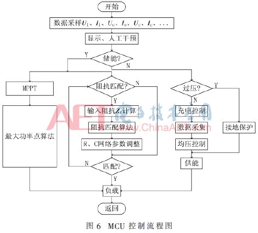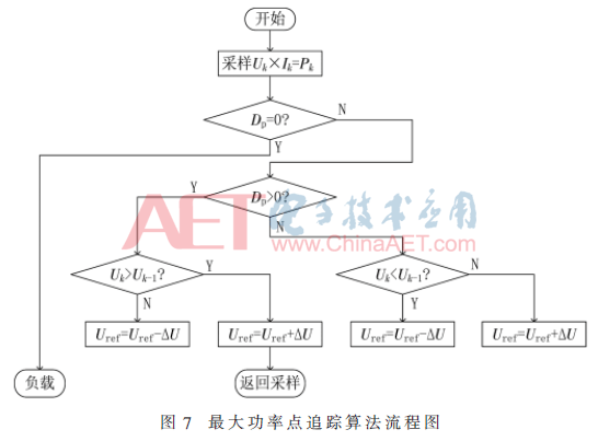 系统因负载和外界干扰等因素影响需嵌入MCU控制,其主要针对MPPT、阻抗匹配、系统监控和超级电容器充放电控制提高整体稳定性。图6所示,系统对输入、阻抗等参数进行采样检测,设定供电方式,直接供电时通过检测输入参数进行MPPT;接负载后进行阻抗匹配。图7为MPPT算法流程图,控制系统对电路施加串扰ΔU,比较时间t和t+1时刻采样值,若差值Dp=0,则保持当前值;若Dp>0或Dp<0则根据Dp对串扰电压ΔU适当增加或者减小。
