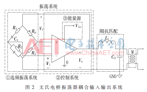考虑低频可再生能源的收集内阻较大,如果使用LC振荡器电路中的电感值较大,不易集成,且电磁损耗大。本系统应用成本低、易集成、功耗相对较低的RC负阻振荡器[3](震荡频率0~70 kHz)代替LC振荡器。如图2所示震荡器主要由振荡发生器电路和阻抗匹配电路两部分组成[4],选频震荡网络通过调节R1、R2、C1、C2,并配合提高震荡稳定性的负反馈电路(RP、R3)来得到不同的输出振荡角频率ω如式(1)所示。