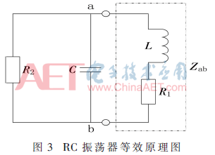 振荡器系统等效原理如图3所示。a、b点为从R2、C2两端向放大器端看去等效阻抗,要使电路满足起振相角条件Zab须满足式(2),A为放大器放大倍数,而放大器A须满足式(3)。