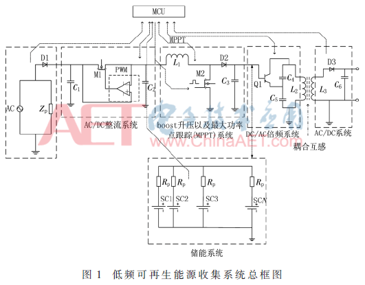 图1所示为低频可再生能源收集系统总框图,主要由整流、升压、储能、互感电路组成。D1为肖特基整流二极管,通过C1滤波电容对输入进行滤波。经AC/DC系统后交流电能转为直流电能。后经MCU程控的 BUCK/BOOST电路,调整输入功率点。MPPT算法后,可以获得最大输入效率。低功耗MCU可应用暂态储能超级电容器直接供电。输入能量转换成直流电能后,需进行DC/AC转换成高频(500 kHz以上)交流电能,再通过互感耦合,进行输出阻抗匹配。图1中Q1、C4、C5、L2、L3构成的典型LC振荡器,它将直流电能转换成高频交流电。L3、D3、C6为次级电感线圈、肖特基整流二极管和滤波电容,由于次级端L3阻抗较小(1 Ω~3 Ω),将感应的高频交流电再次转换成直流后(AC/DC)输出内阻较小(5 Ω~10 Ω),可提高带负载能力。