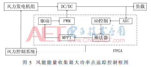 当不规则的能量经过整流后,通过由整流管M1、R2、R3组成的采样反馈稳压电路,将交流电能整流成直流电能;经由M2、M3、M4、M5、L1、D6、C3构成的BUCK/BOOST电路调整输出;根据MPPT算法,通过MCU控制MOS管M3和M4的通断升压或降压,M3导通M4截止时为升压,M4导通M3截止时为降压;采用登山法或叫干扰观测法,给系统一个突变电压ΔU通过MCU检测实时功率,实现MPPT控制。以风能 MPPT流程图为例说明控制原理,如图5所示。发电系统通过FPGA芯片反馈采样,根据MPPT算法,通过控制PWM波的脉冲宽度调整BOOST/BUCK电路和风力控制系统,从而为负载提供最大输出功率。