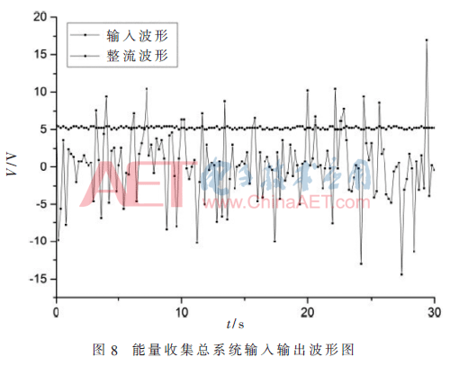 传统能量收集电路主要针对断续性的能量进行收集,并且以牺牲转化效率为代价提高整流波形。图8所示研究中输入端内阻为50 Ω,输入电压最大幅值为14.2 V。通过系统整流输出端负载内阻10 Ω,端电压5 V;纹波±300 mV,纹波电压抑制比0.04。提高了低频能量收集范围和能量收集效率,同时经过耦合隔离后提高了输出端的带负载能力,且输出端满足耦合后直流输出效果。