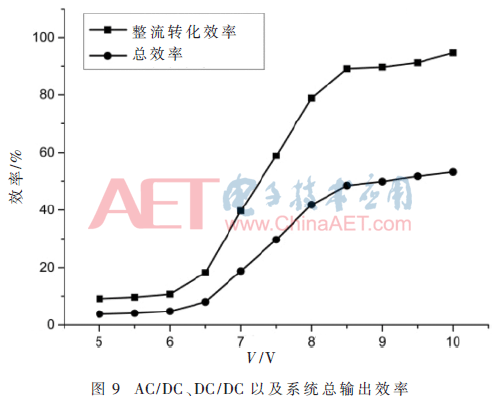 图9所示为50 Hz不同幅值正弦波输入下的AC/DC整流效率以及系统输出总效率。首先分析整流系统曲线,整流系统在6.5 V处转化效率成线性上升,在8 V处转化效率达到约80%,随电压继续上升,效率涨幅不大,逐渐趋于稳定值,在输入幅值为10 V处系统的转化效率达到最大值,最大转化效率可达91.16%。可知该系统适用于幅值8 V以上的交流能量源进行高效的收集;总系统在5 V处出现上升趋势,随电压继续上升在6.5 V左右效率增长幅度增大,当电压达到8.5 V以后,效率涨幅变缓,逐渐趋于稳定值。在输入幅值为10 V处系统的转化效率达到最大值,最大转化效率可达53.18%,由于加入耦合系统,总系统效率下降,但总系统可收集能量输入电压阈值降至5 V,并且曲线平缓,提高了系统能量收集稳定性。