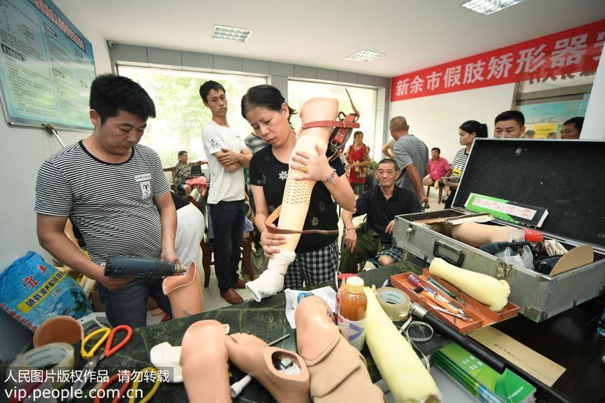 9月7日,江西省新余市残联的工作人员在为假肢进行微调适配。