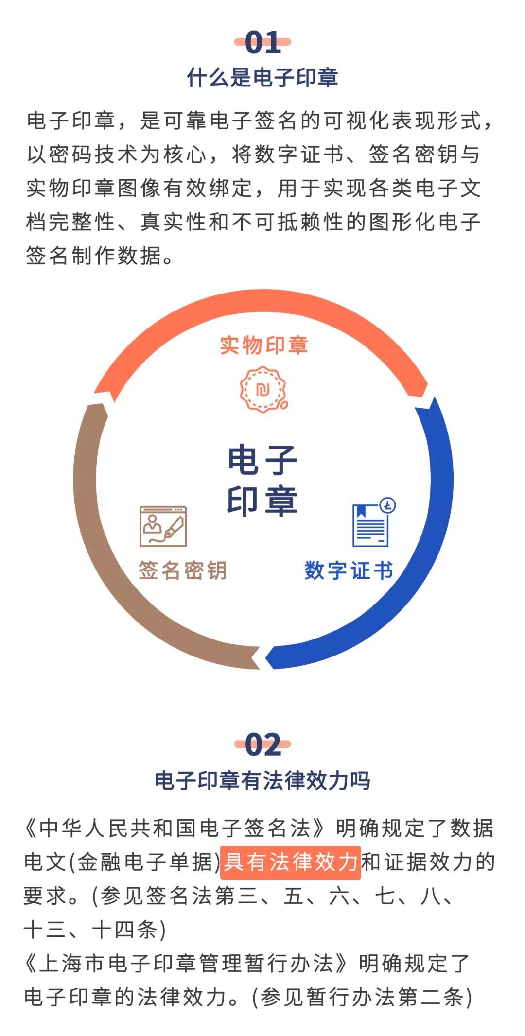 电子印章是可靠电子签名的可视化表现形式,以密码技术为核心,将数字证书、签名密钥与实物印章图像有效绑定,用于实现各类电子文档完整性、真实性和不可抵赖性的图形化电子签名制作数据。《中华人民共和国电子签名法》《上海市电子印章管理暂行办法》都明确规定了电子签名、电子印章和手写签名、实体盖章具有同等的法律效力。最近国务院常务会议通过了《电子签名法》修正案草案,允许在办理土地、房屋等转移登记时使用电子文书,电子签名将在这一领域有新的应用突破。