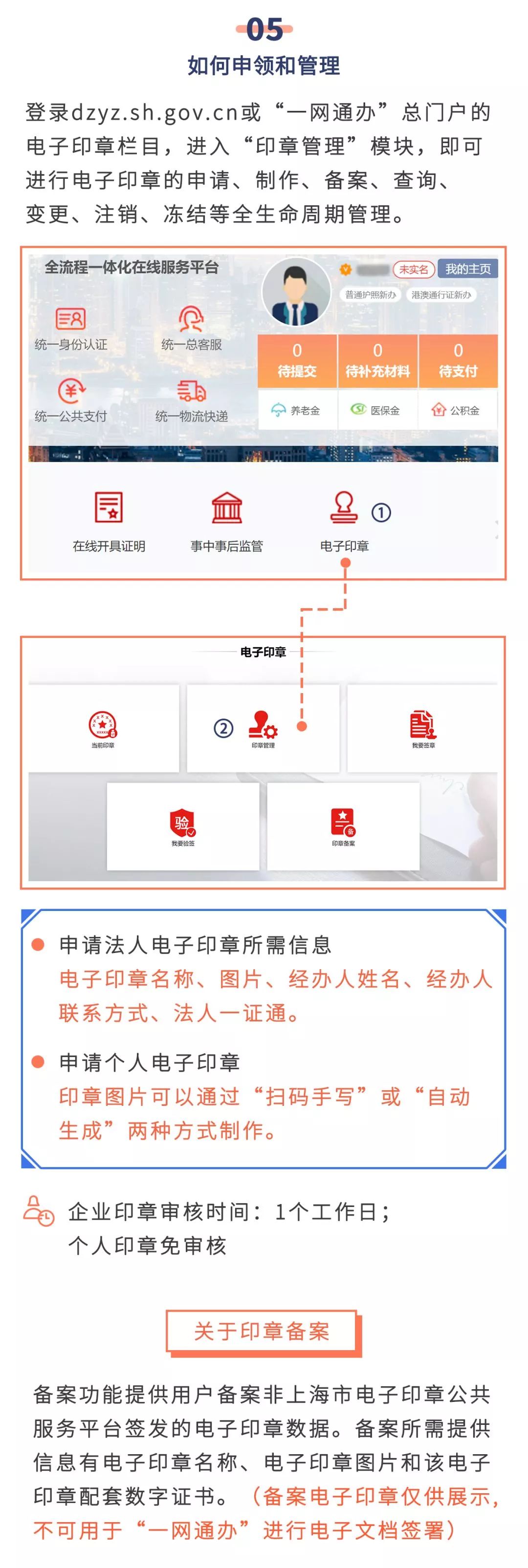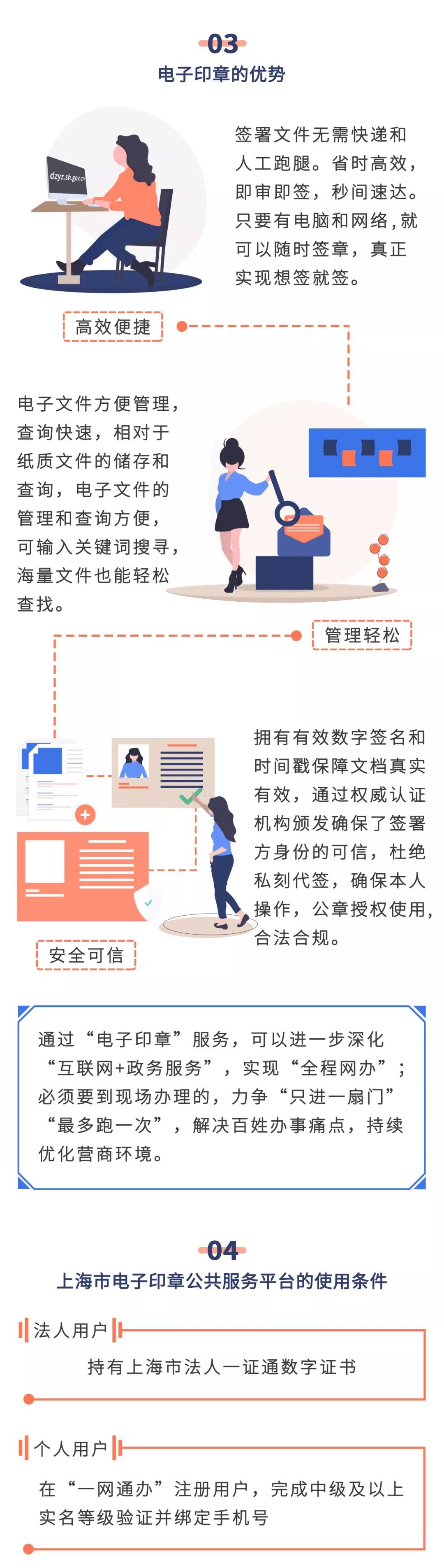 为进一步方便企业、方便群众,上海电子印章公共服务平台于11日正式上线。企业用户通过“法人一证通”数字证书、个人用户通过一网通办实名认证,即可登录上海市电子印章公共服务平台(dzyz.sh.gov.cn),对电子印章和电子签名进行包括申请、制作、备案、查询、变更、注销、冻结等全生命周期管理。通过该平台,上海将全面实现对各类法人电子印章和个人电子签名的统一制作与管理,逐步实现签署文档在全市电子政务的互通互认,大大节约企业办事成本、减少市民办事奔波。