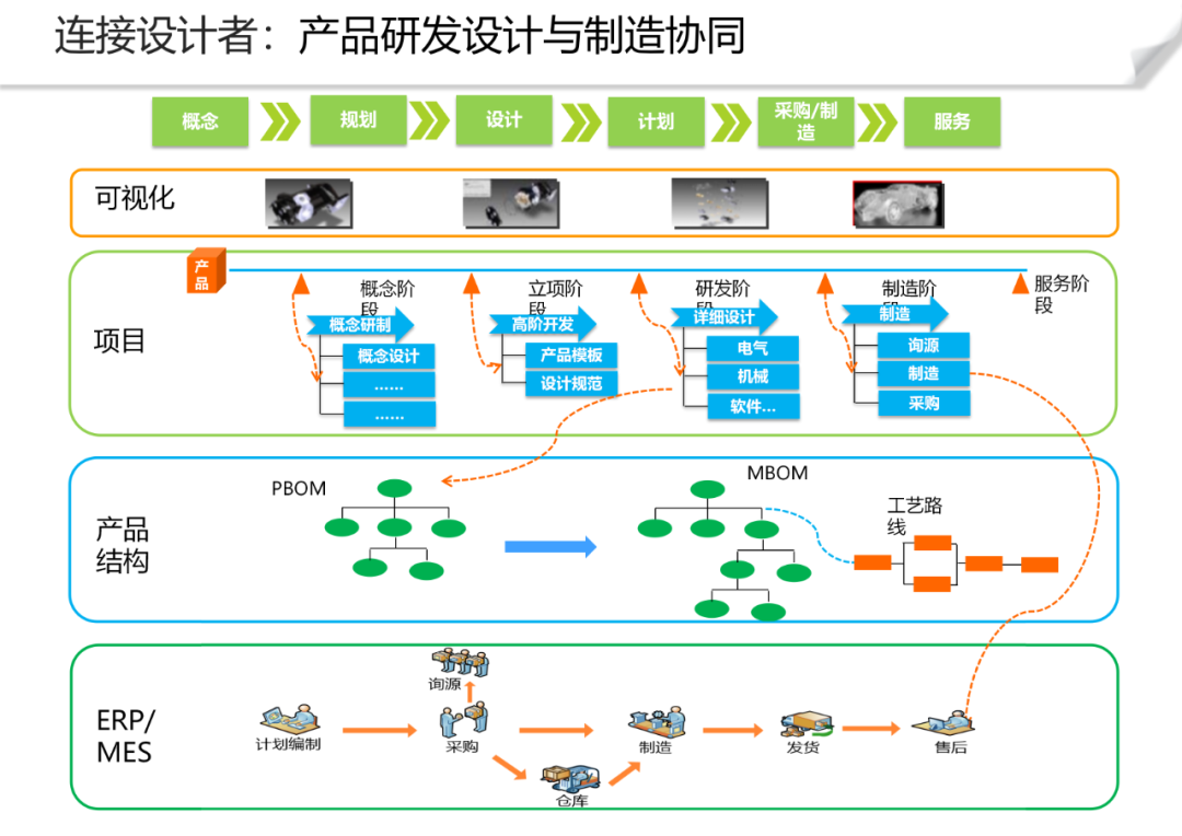 连接设计者 :实现产品研发设计与制造协同,包括产品结构、PBOM、MBOM、工艺路线等的规划和设计。