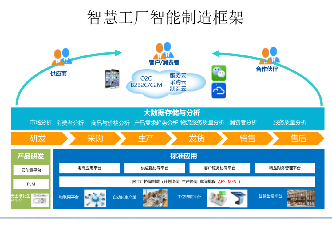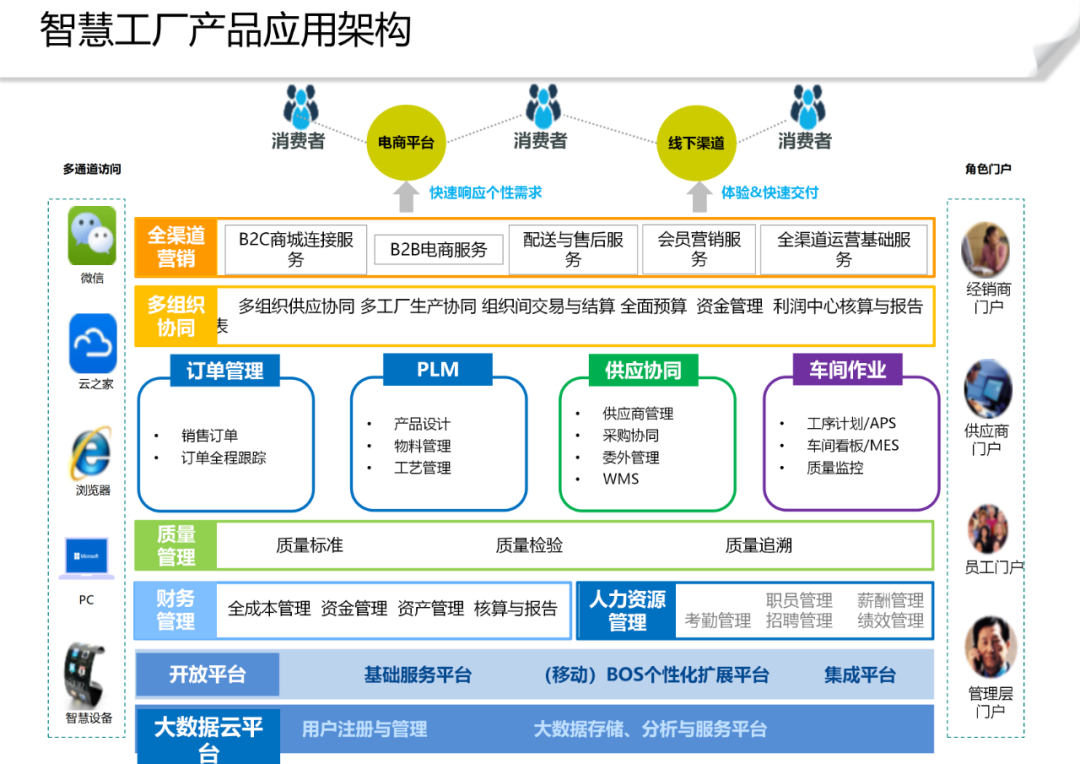 产品应用架构 :涵盖产品设计、物料管理、工艺管理、供应协同、车间作业、财务管理、人力资源管理、质量管理、全渠道营销等多个方面,通过集成平台和大数据云平台实现多组织协同和全渠道运营。