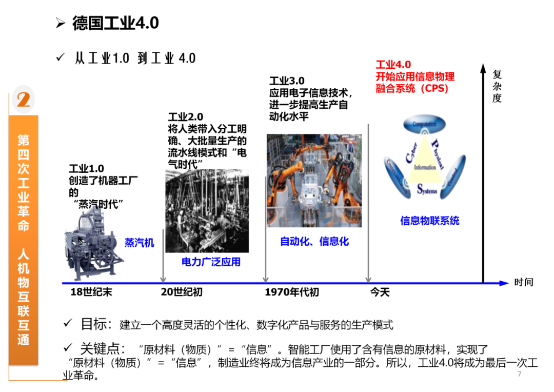 德国工业 4.0 :工业 4.0 的目标是建立高度灵活的个性化、数字化产品与服务的生产模式,其三个核心是 “智能工厂”、“智能生产” 和 “智能物流”,三大主题是端到端数字集成、垂直集成和网络化的制造系统、价值网络实现横向集成。工业 4.0 将对商业模式产生影响,同时也面临推进工作的组织、标准协议统一、商业模式重组、产品接受度和企业内部改变等挑战。