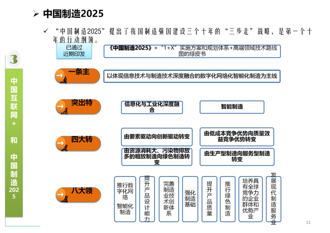 中国制造 2025 :提出了我国制造强国建设三个十年的 “三步走” 战略,以体现信息技术与制造技术深度融合的数字化网络化智能化制造为主线,突出信息化与工业化深度融合的特点,包括推行数字化网络智能化制造、提升产品设计能力、完善制造业技术创新体系、强化制造基础、提升产品质量、推行绿色制造、培养具有全球竞争力的企业群体和优势产业、发展现代制造服务业等八大领域。