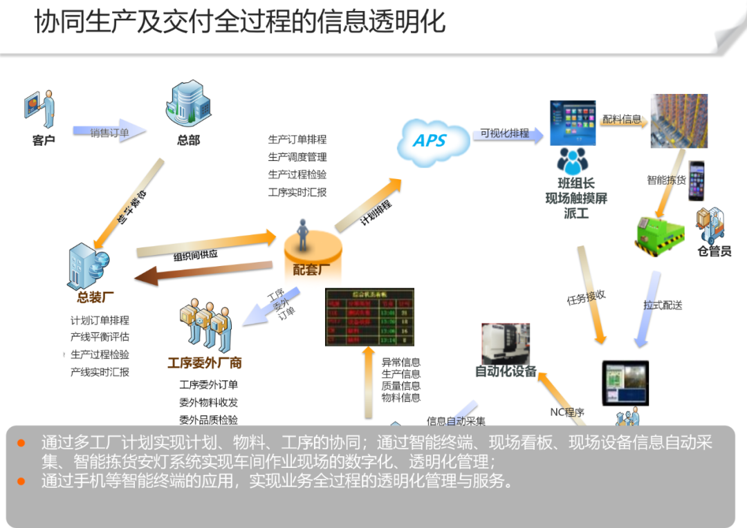 协同生产及交付全过程的信息透明化 :通过多工厂计划实现协同,通过智能终端、现场看板、设备信息自动采集和智能拣货等实现车间作业现场的数字化、透明化管理,通过手机等智能终端实现业务全过程的透明化管理与服务。