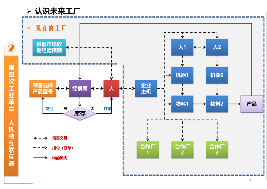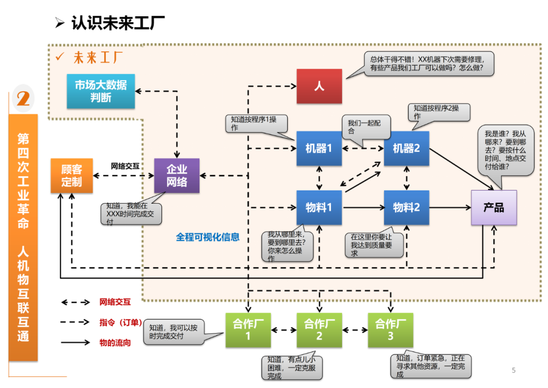 认识未来工厂 :未来工厂将实现人机物互联互通,通过市场大数据判断和网络交互,实现全程可视化信息,满足客户定制需求,确保按时交付,并能对设备和生产进行智能管理。