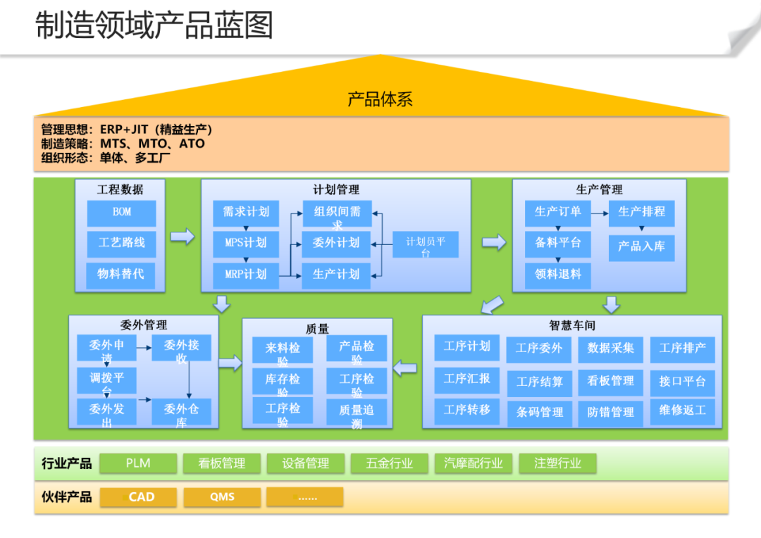 制造领域产品蓝图 :包括 CAD、QMS、PLM 等伙伴产品和行业产品,以及计划管理、生产管理、委外管理等功能,支持 MTS、MTO、ATO 等制造策略和单体、多工厂等组织形态。