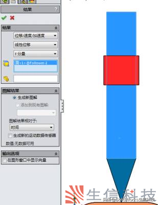 如图12和13,14所示,单击结果和图解,选择位移/速度/加速度——>跟踪路径。在要测量的实体中选择从动件的顶点及凸轮的圆柱面。确定之后即获得一个跟踪路径,此路径即为凸轮的轮廓。