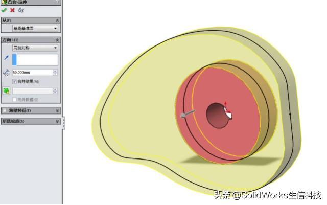 打开凸轮,在设计树中将有一个曲线,在前视基准面上绘制草图,并用转换实体引用命令,将此曲线引用,接着对草图进行拉伸。如图16