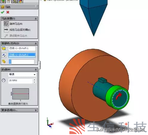 ④.给凸轮添加旋转马达,使凸轮在从动件的一个运动周期中旋转一圈。如图8,旋转马达的位置选择传动轴的边线。运动类型设置为等速,每分钟20圈,确定。