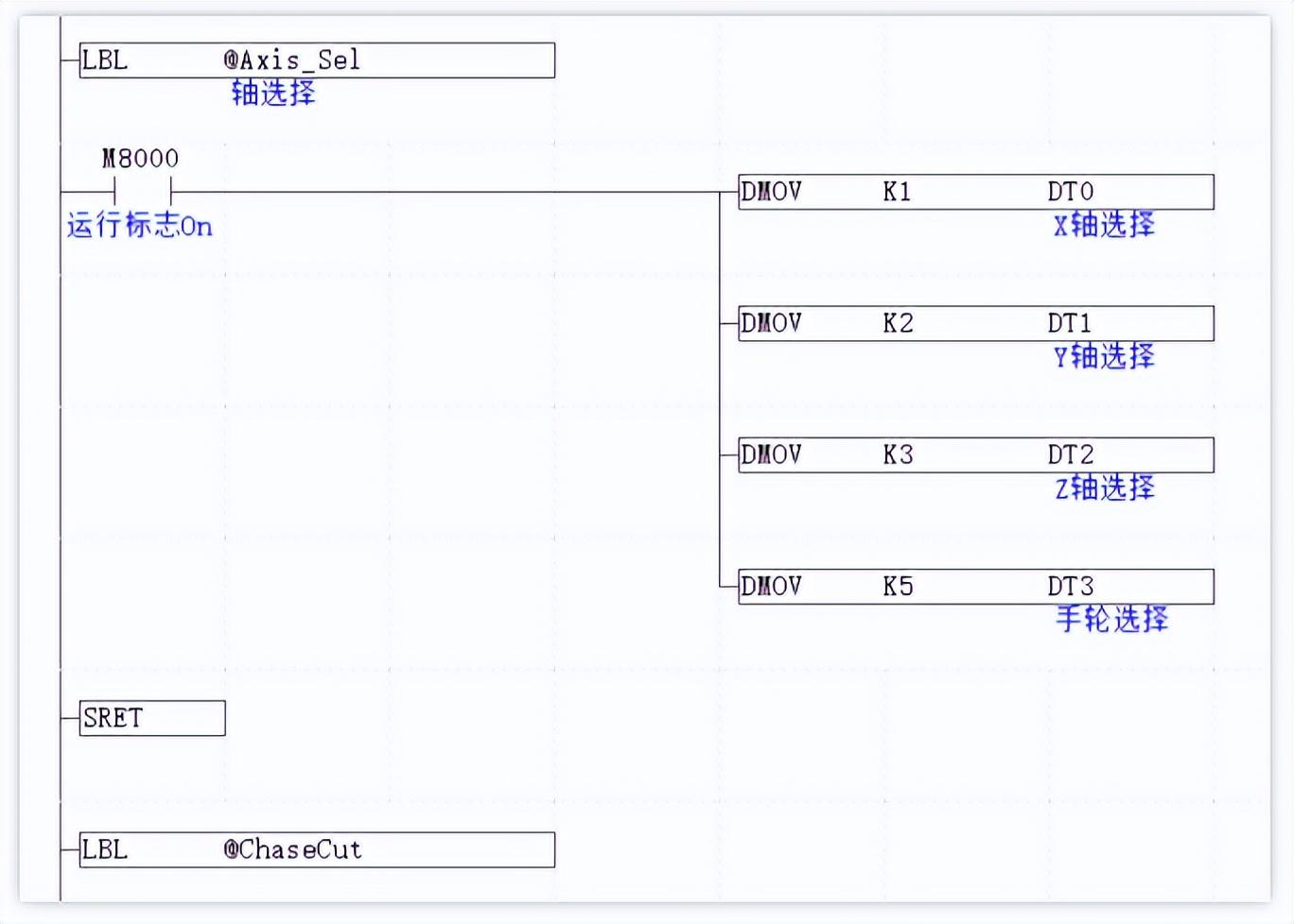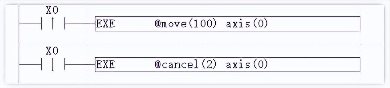 M8100为轴0的IDLE标志,当运动完成时,轴0停止,M8100变为ON,M1被置位一个周期,M1的常闭触点断开一个周期,M0自锁取消。