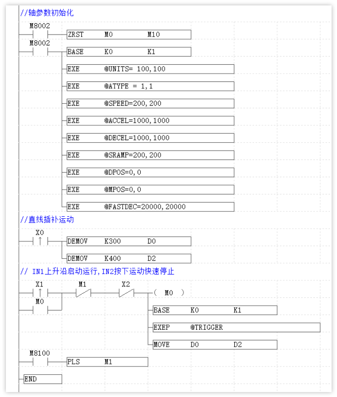 当X0上升沿触发时,对存储两个轴运动距离的寄存器D0、D2进行赋值,当X1上升沿触发启动示波器采样、开启MOVE直线插补运动并且M0自锁,轴0运动距离为300,轴1运动距离为400。