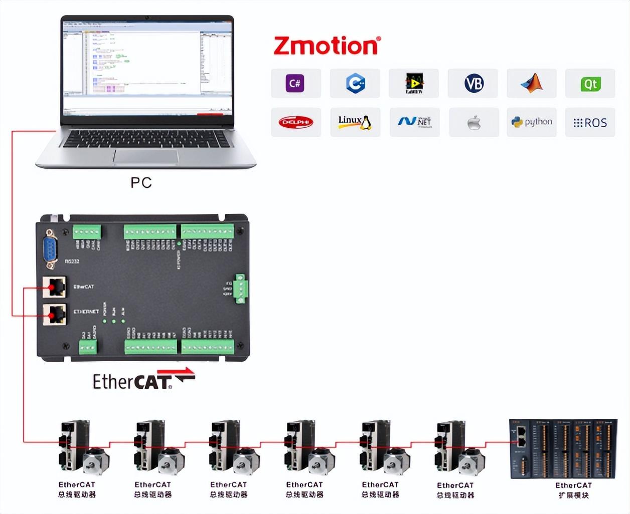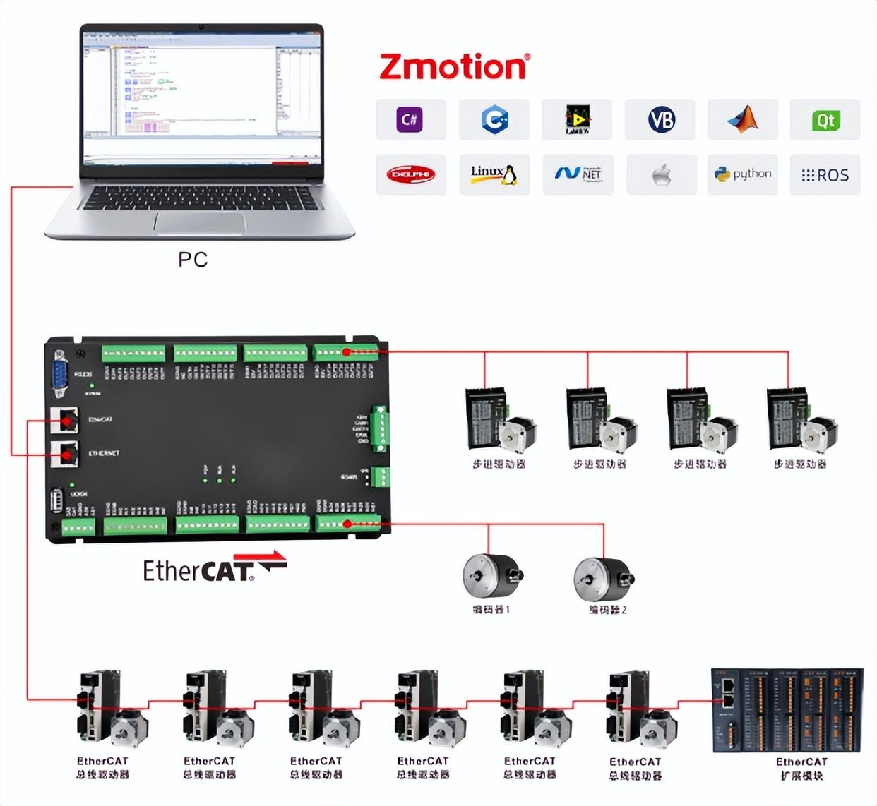 在正运动技术官网下载新版编程软件ZDevelop V3.10.06,准备一台XPLC系列经济型EtherCAT总线运动控制器,按照上方的XPLC006E参考架构完成接线。