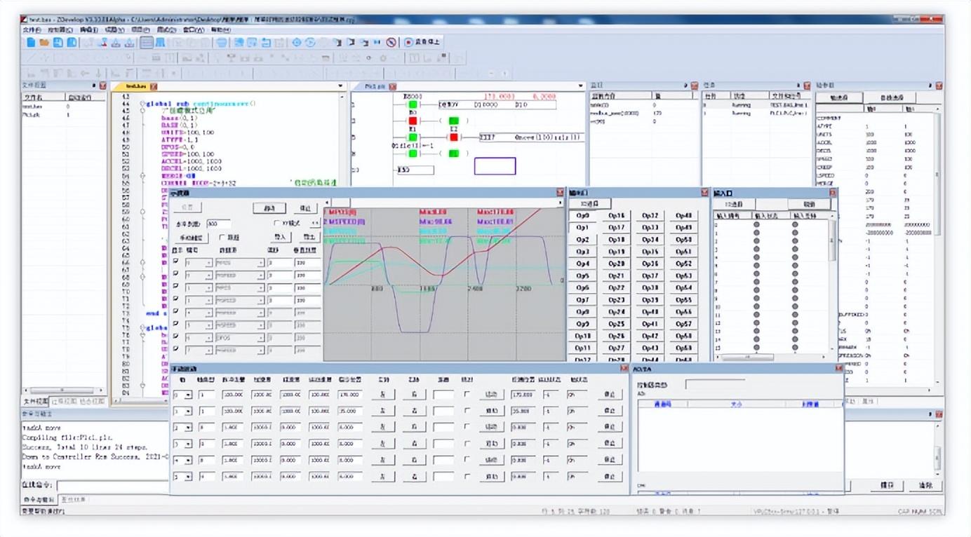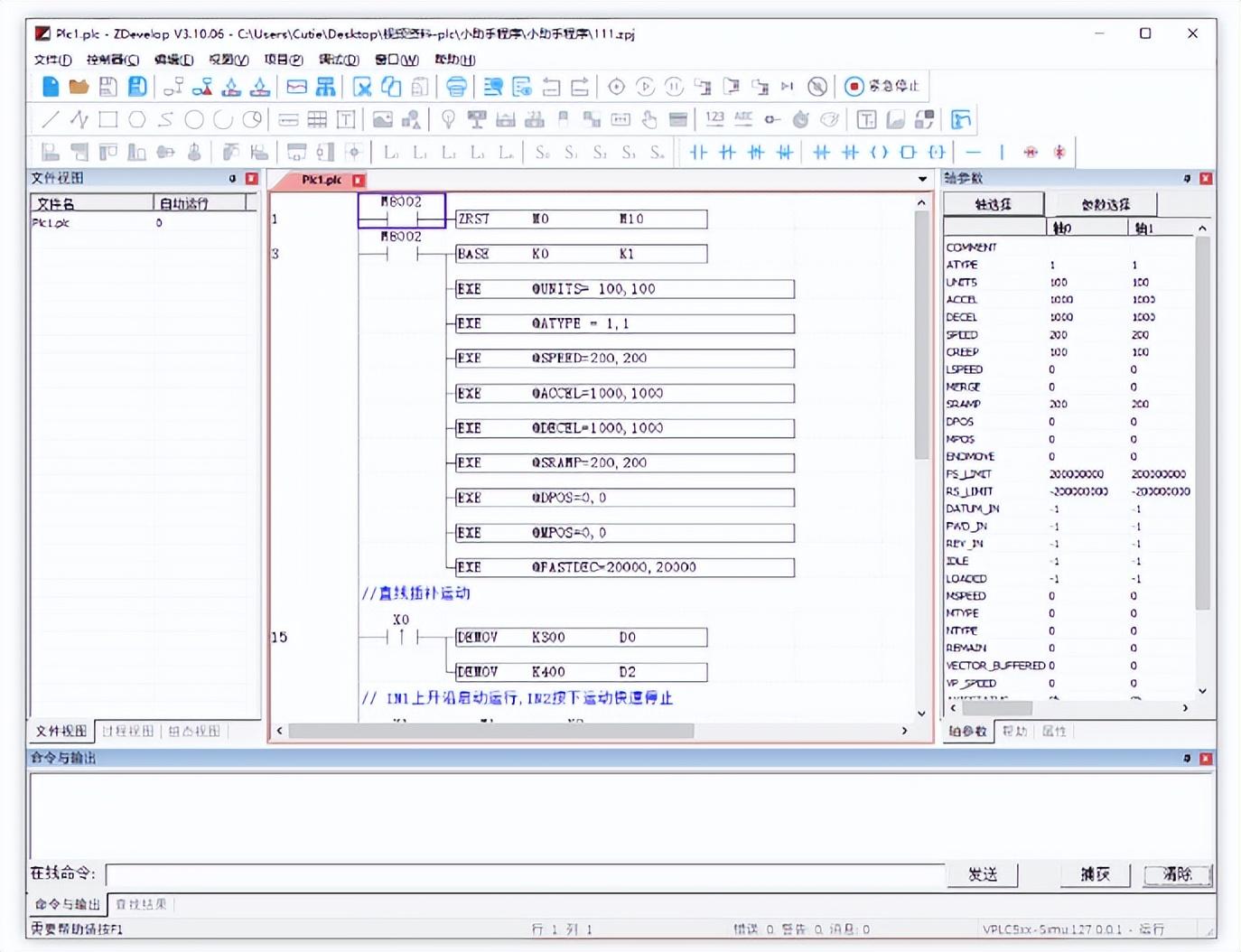 2.打开已有的项目文件运行,需要打开zpj文件,再连接控制器,下载程序运动。PLC编程界面如下所示: