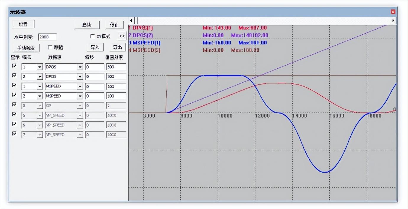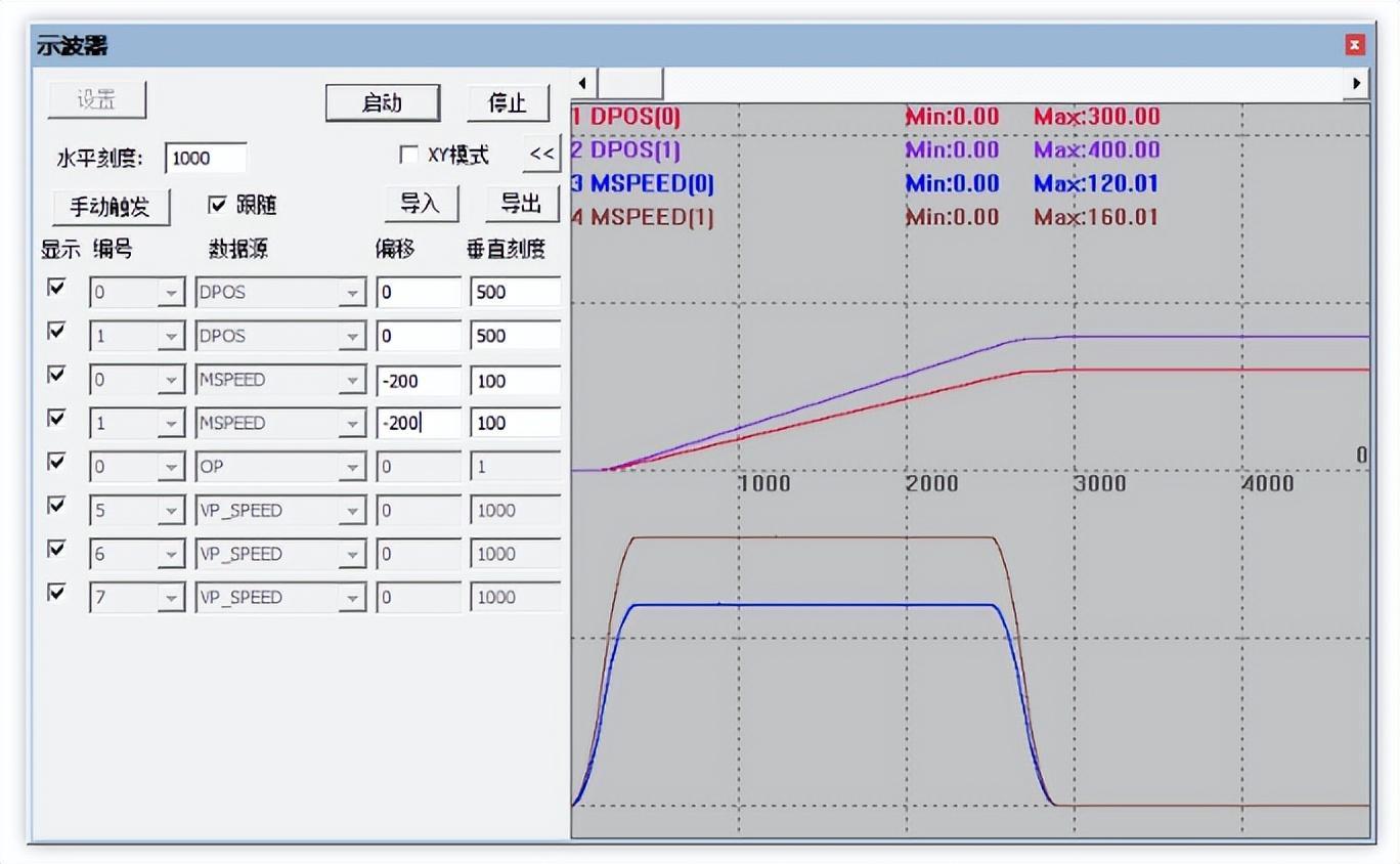 3.示波器采样的轴0轴1的位置和速度曲线如下所示。