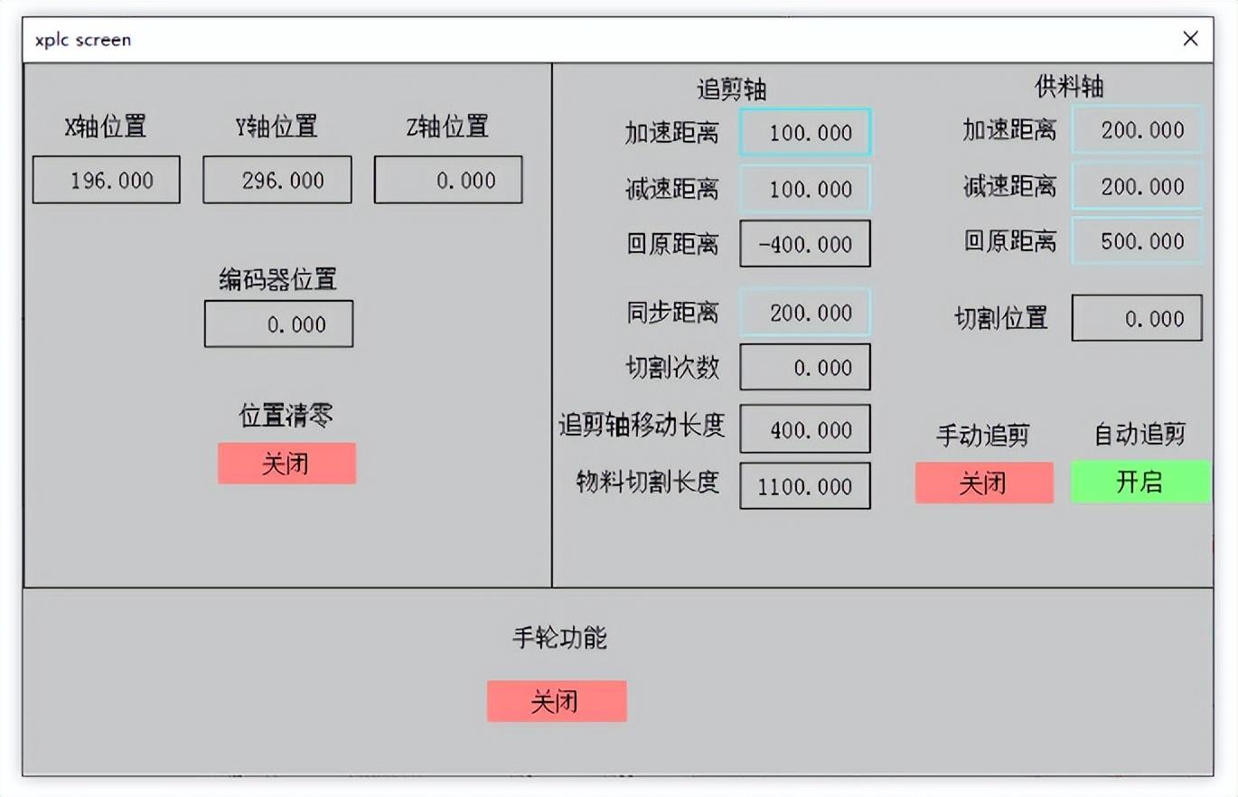 触摸屏界面:可设置追剪加工参数,控制追剪的启停,同时能显示当前轴的位置信息。
