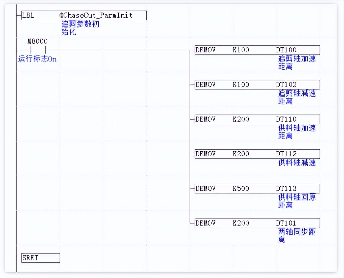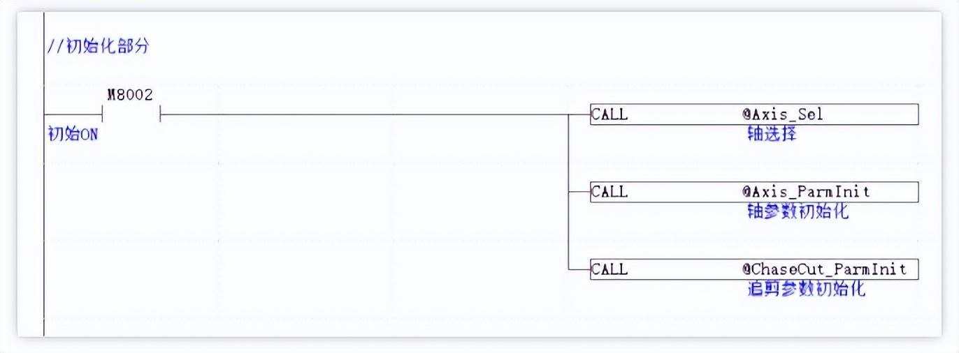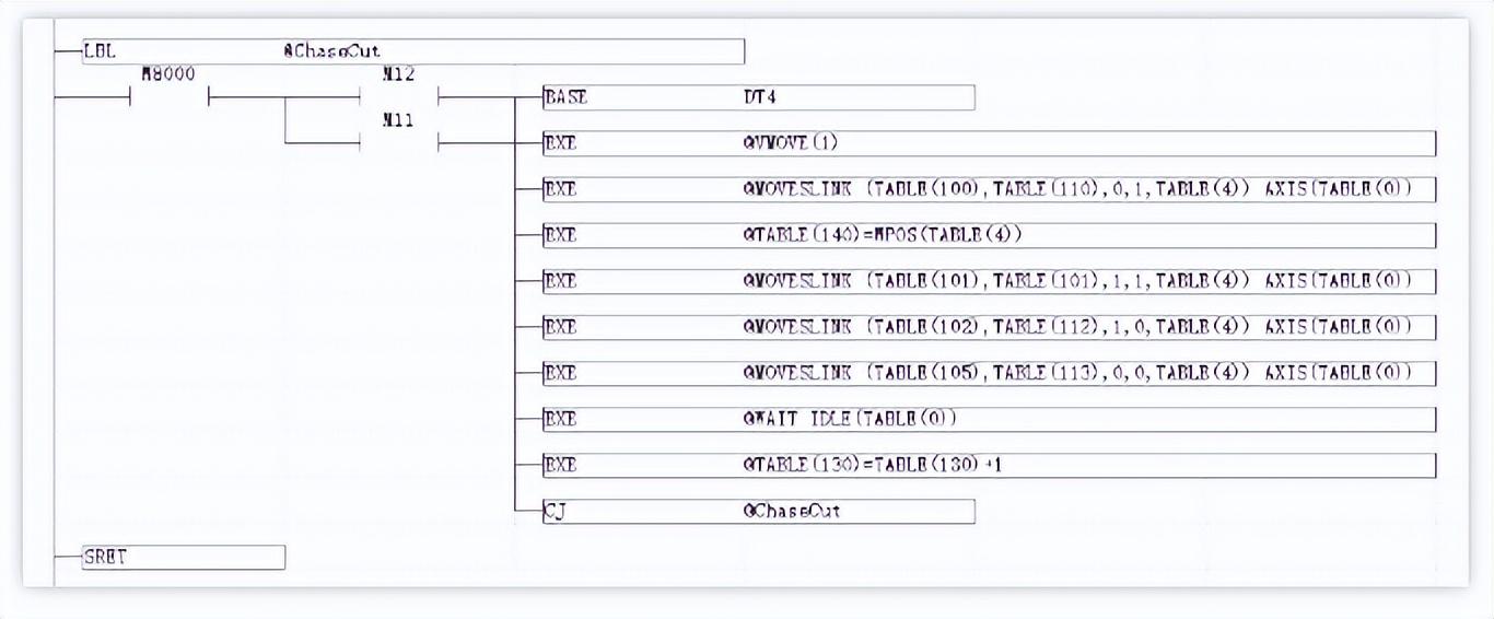 PLC通过调用Basic的MOVESLINK自动凸轮命令完成追剪过程,MOVESLINK自动凸轮的从轴自动规划速度跟随主轴运动,指令用法参见Basic编程手册,PLC程序的主要组成部分如下: