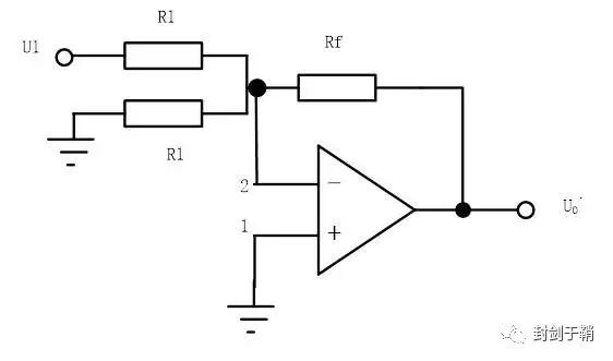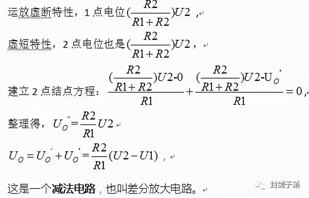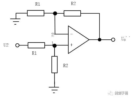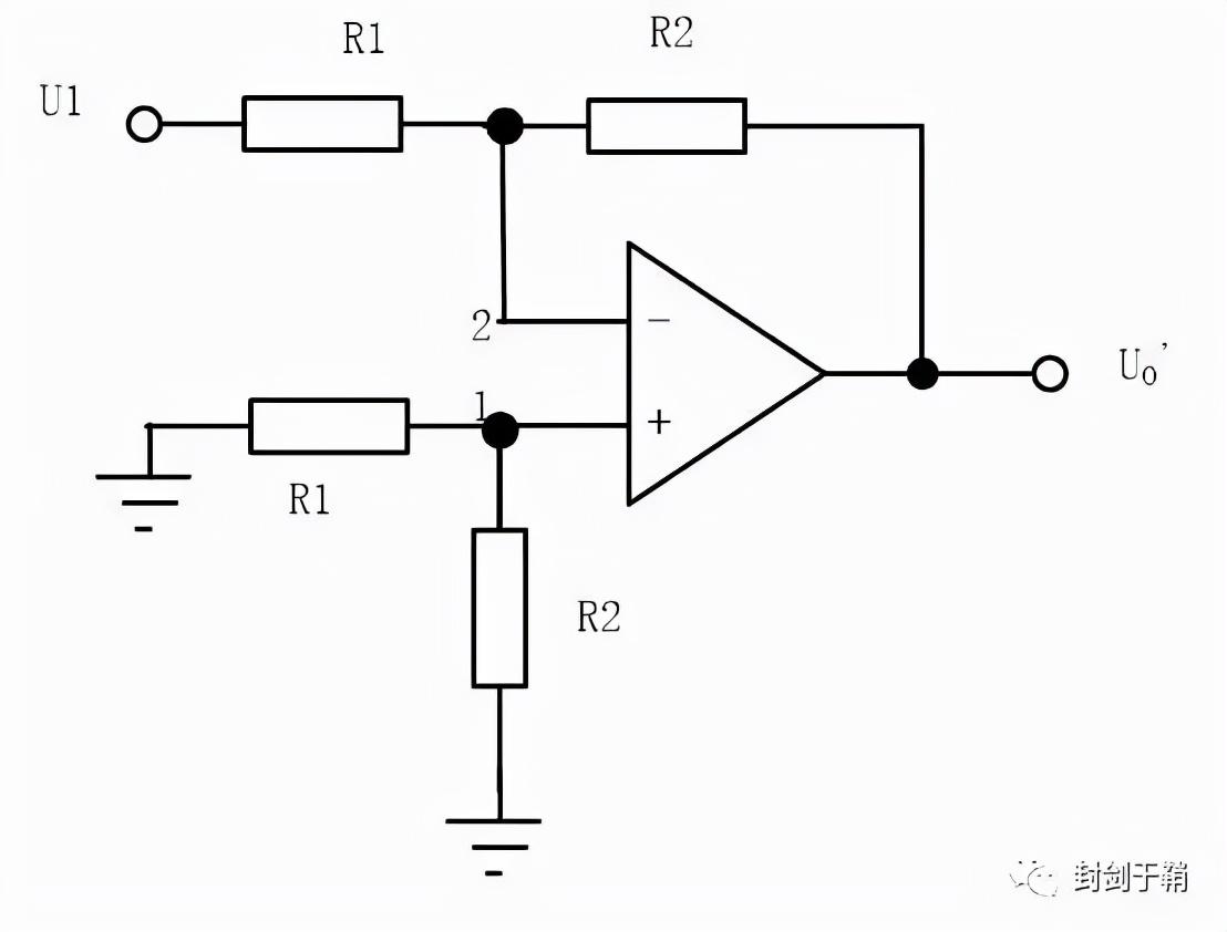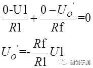先将U2置0,只保留U1,由1点的电压为0,根据运放虚短特性,2点电压亦为0V,建立2点的结点方程:
