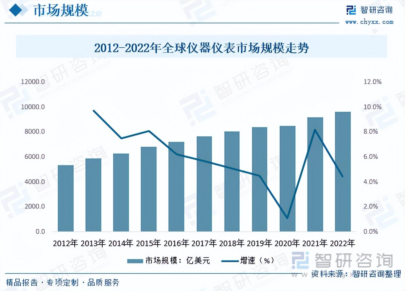 仪器仪表应用领域广泛,覆盖了工业、农业、交通、科技、环保、国防、文教卫生、人民生活等各方面,在国民经济建设各行各业的运行过程中承担着把关者和指导者的任务。由于其地位特殊、作用大,对国民经济有巨大倍增和拉动作用,有着良好的市场需求和巨大的发展潜力,世界发达国家都高度重视和支持本国仪器仪表产业的发展。数据显示,2012年全球仪器仪表市场规模约5354亿美元,2022年我国仪器仪表市场规模增长至约9614.5亿美元,较2021年增长4.47%左右。
